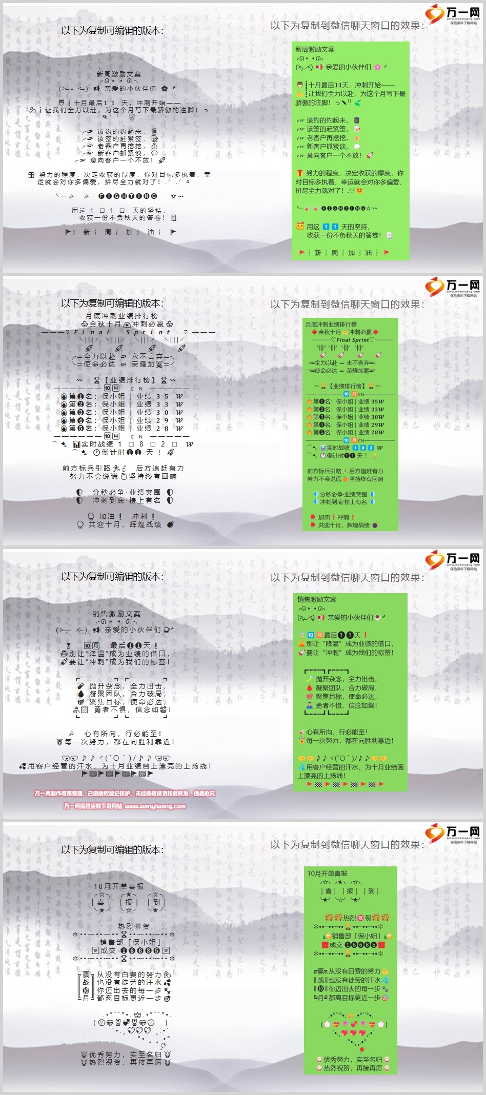 新周激励文案,亲爱的小伙伴们,十月最后11天,冲刺开始,让我们全力以赴,为这个月写下最骄傲的注脚!该约的约起来,该签的赶紧签,老客户再挖挖,新客户抓紧谈,意向客户一个不放!努力的程度,决定收获的厚度,你对目标多执着,幸运就会对你多偏爱,拼尽全力就对了!用这11天的坚持,收获一份不负秋天的答卷!